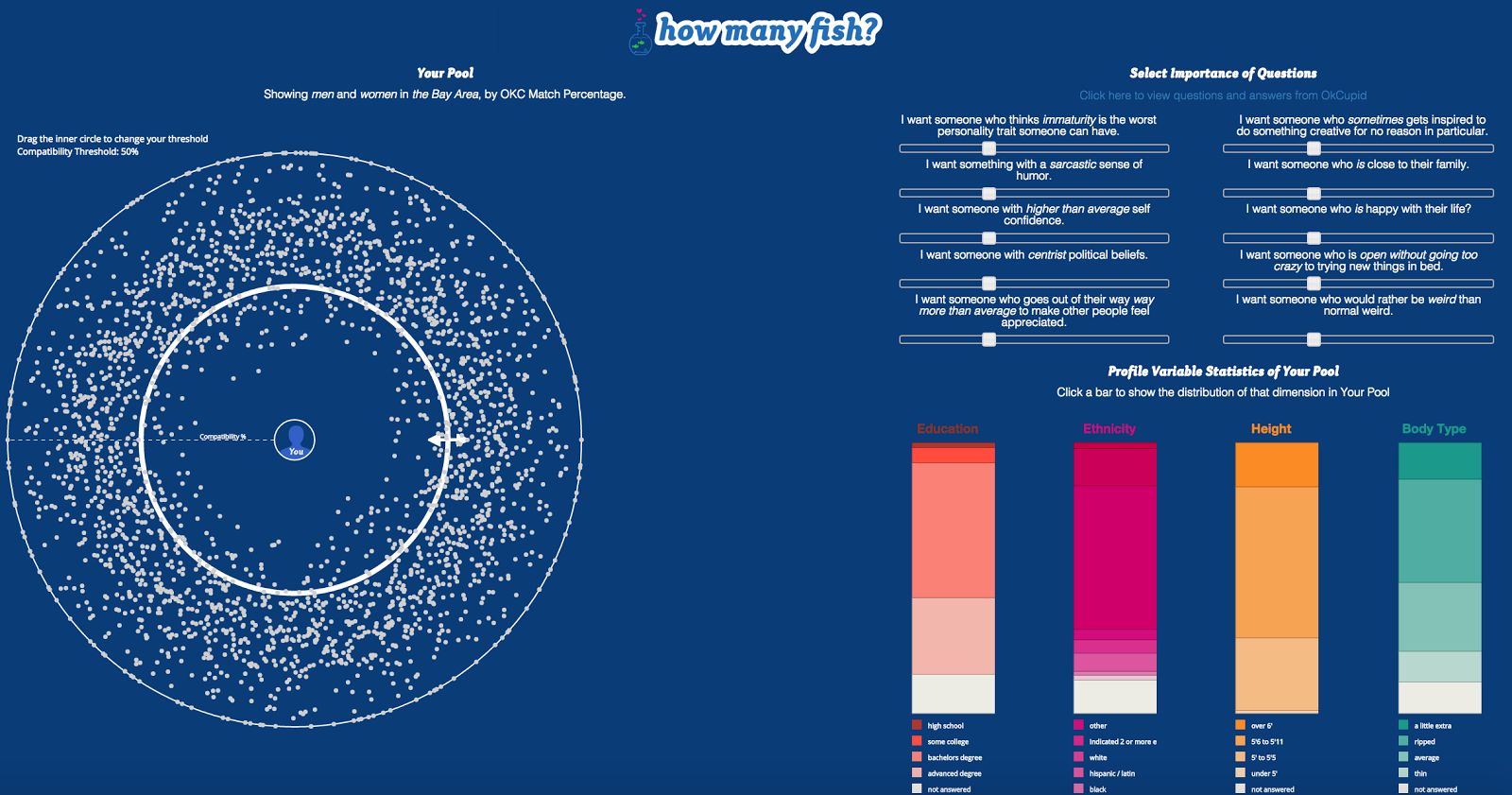 How Many Fish?, a visualization tool, allows OkCupid users to play with their profile preference settings to explore the effects on their pool of potential matches. The goal is to encourage users of online dating services to consider impacts of their preference settings.