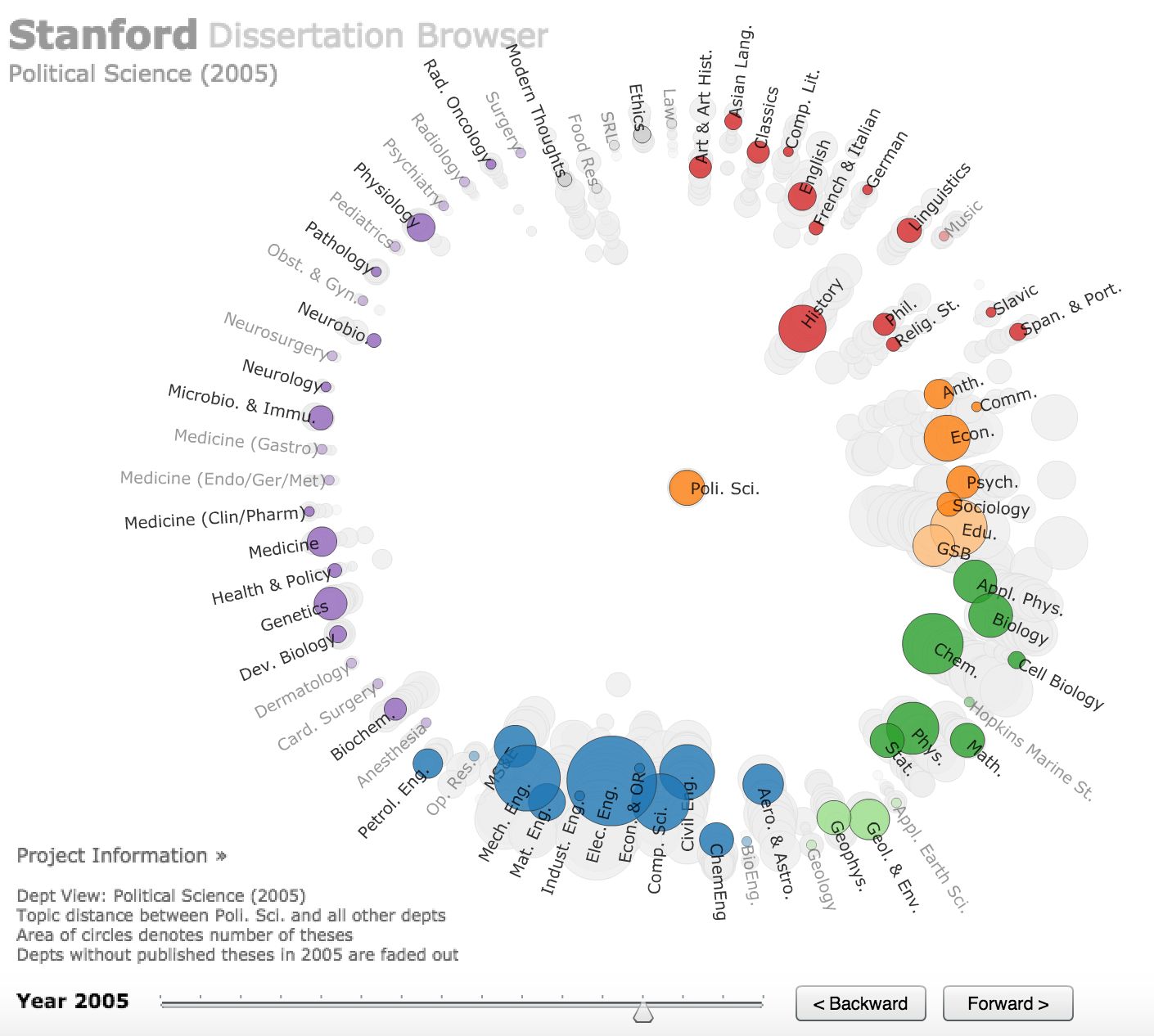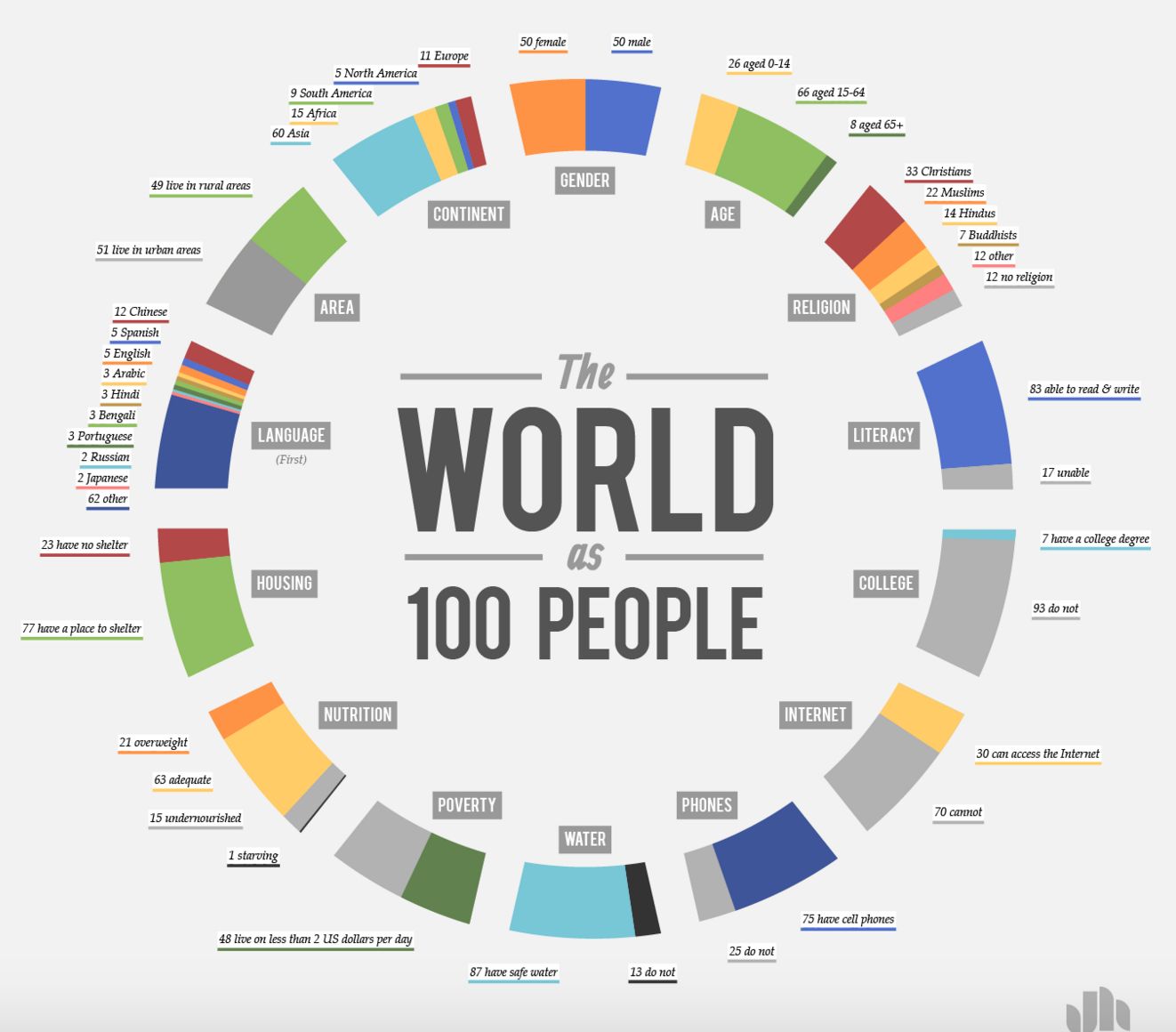 We drew inspiration from existing circular data visualizations including Stanford's NLP group (left) and Jack Hagley's The World as 100 People Visualization (right):