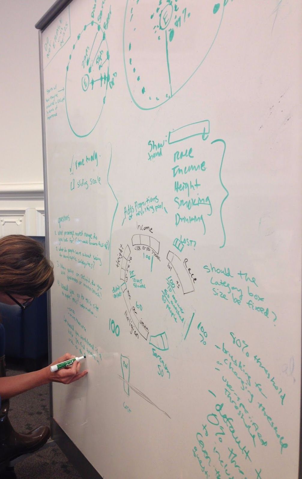 With the circular inspiration, we then sketched out how to tie together the user answering OkCupid dating preference questions and the pool of potential matches changing. Plus, color highlighting pertaining to demographic data.