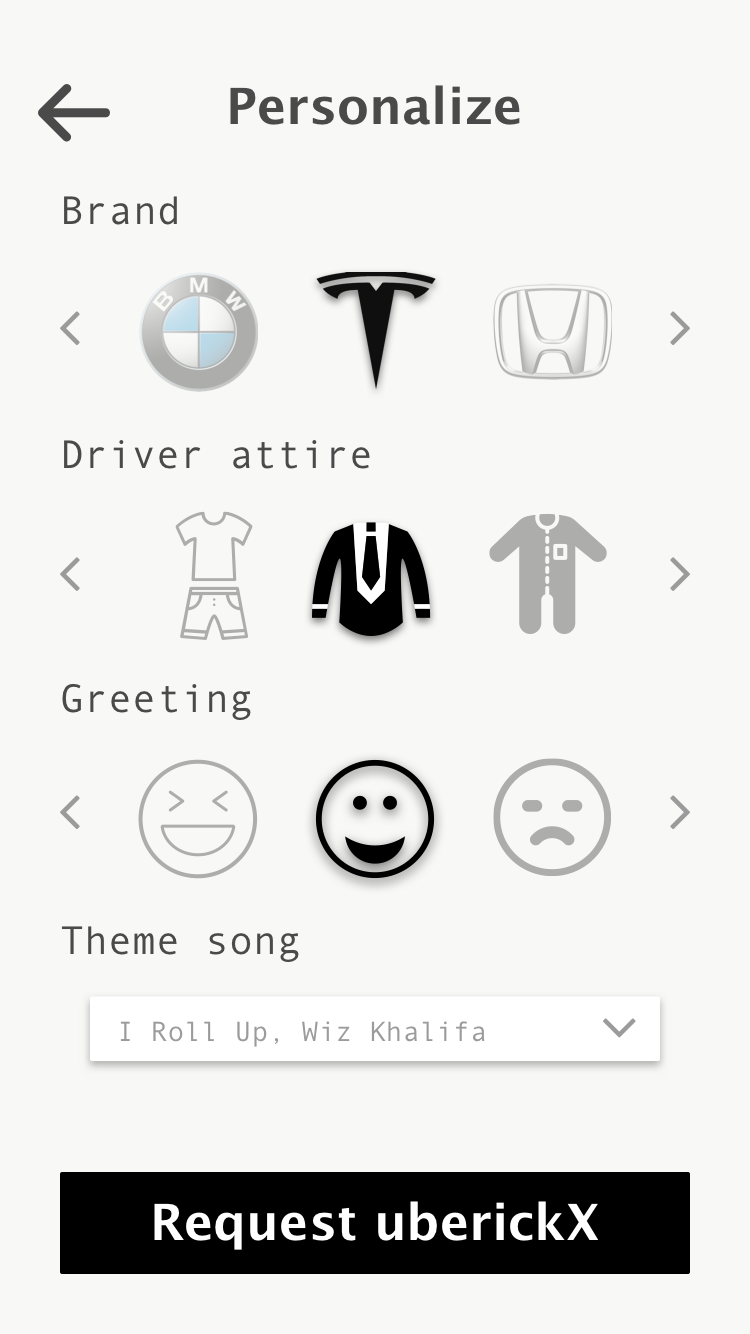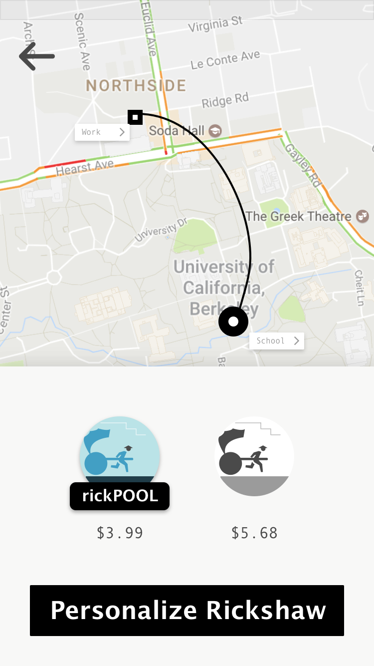 Uberick is a critical design piece re-imagining Uber-esque ride sharing services as the primary mode of transportation in the 1920s. The Uber model and app is applied to the traditional rickshaw and the personalization aspects are taken to an extreme by allowing riders to choose their car brand, a theme song, their driver’s attire, and the manner in which the driver greets them. Rickshaws, a visually salient representation of class differences between the puller and rider and of the service industry more generally, are juxtaposed against the sleek Uber app and business model that is focused on automation, efficiency, and personalization. The goal of this juxtaposition is to call into question concerns of de-humanization of human service labor.