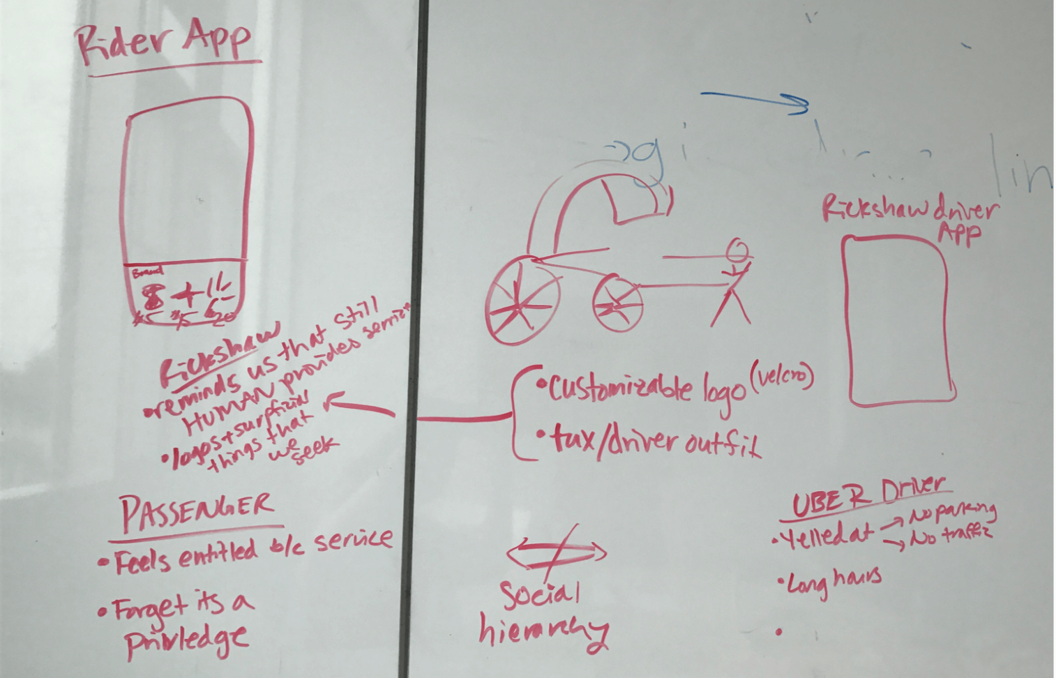Starting with our project prompt of human forms of transportation, we were immediately drawn to rickshaws as they so saliently show de-humanization of the puller. We then needed a design that would provoke questions and discussion around de-humanization of service workers.
